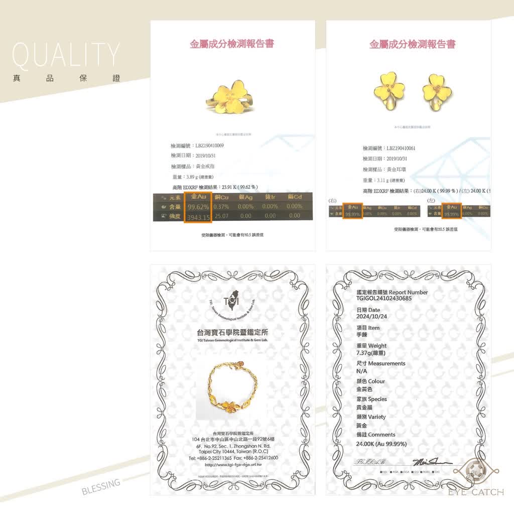 純足黃金手鍊兩條、純足黃金耳環一副、純足黃金戒指一枚