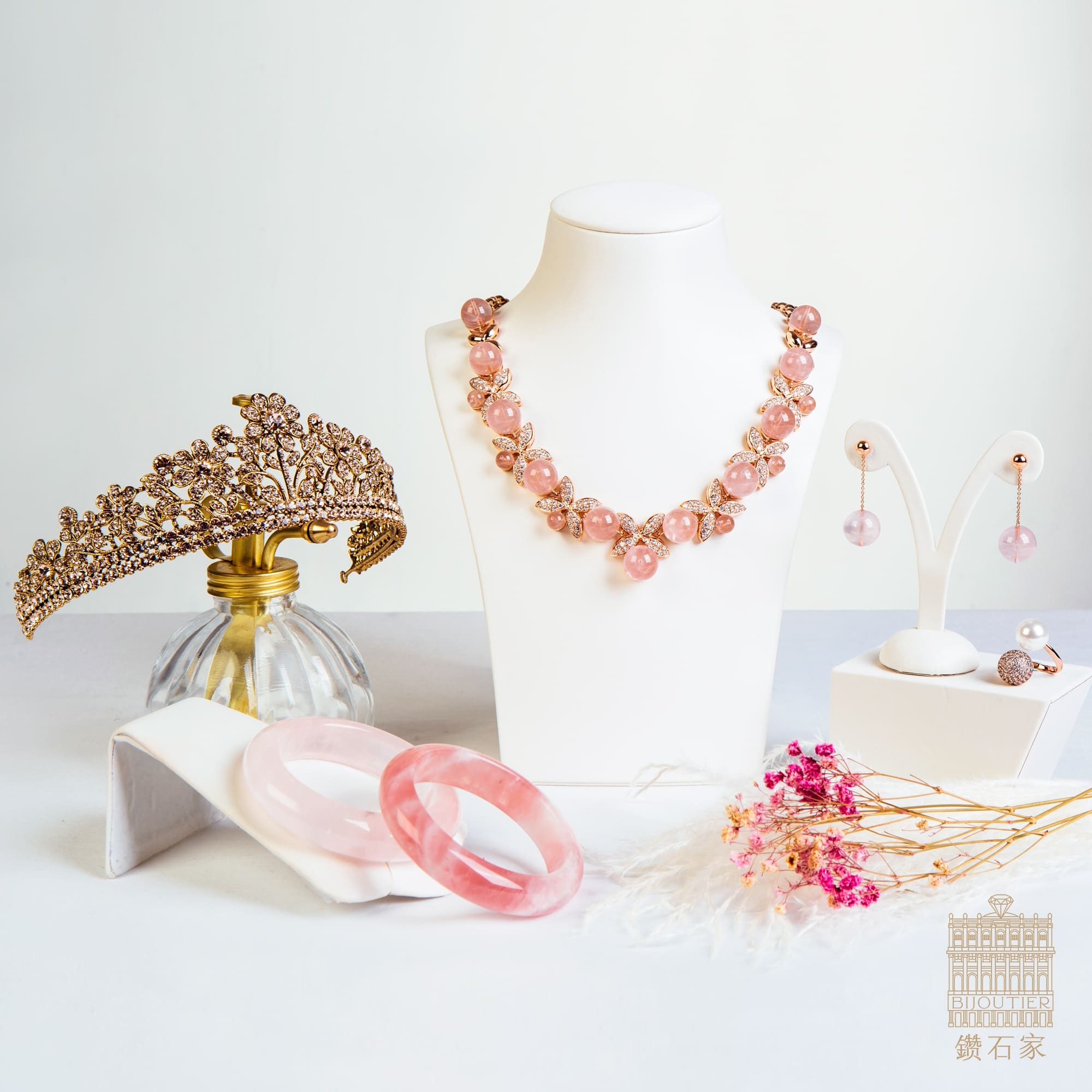 星光粉水晶玫瑰金套鍊、馬達加斯加天然粉水晶手環、馬達加斯加天然草莓水晶手環、施華洛世奇k黃水鑽皇冠、施華洛世奇球形水鑽珍珠戒指。