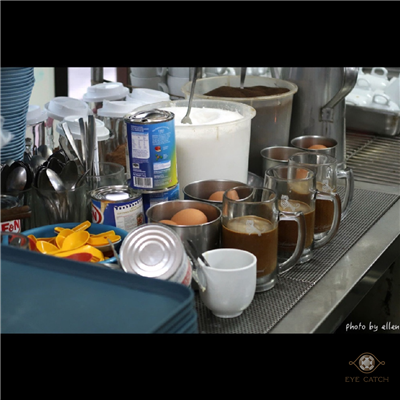 飲料需知縮語的意思: Kopi指加煉奶的黑咖啡, Kopi-O只加糖, Kopi-C加糖和淡奶, 什麼都不想加就是Kopi-O kosong, 茶(teh)同樣適用, 我選加煉奶, 甜度僅一分糖程度, 主要增加不少奶香