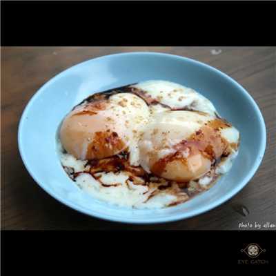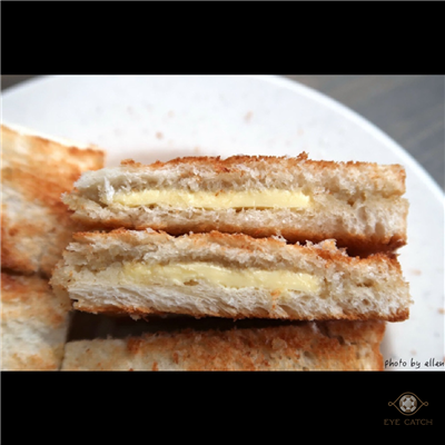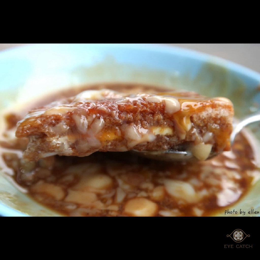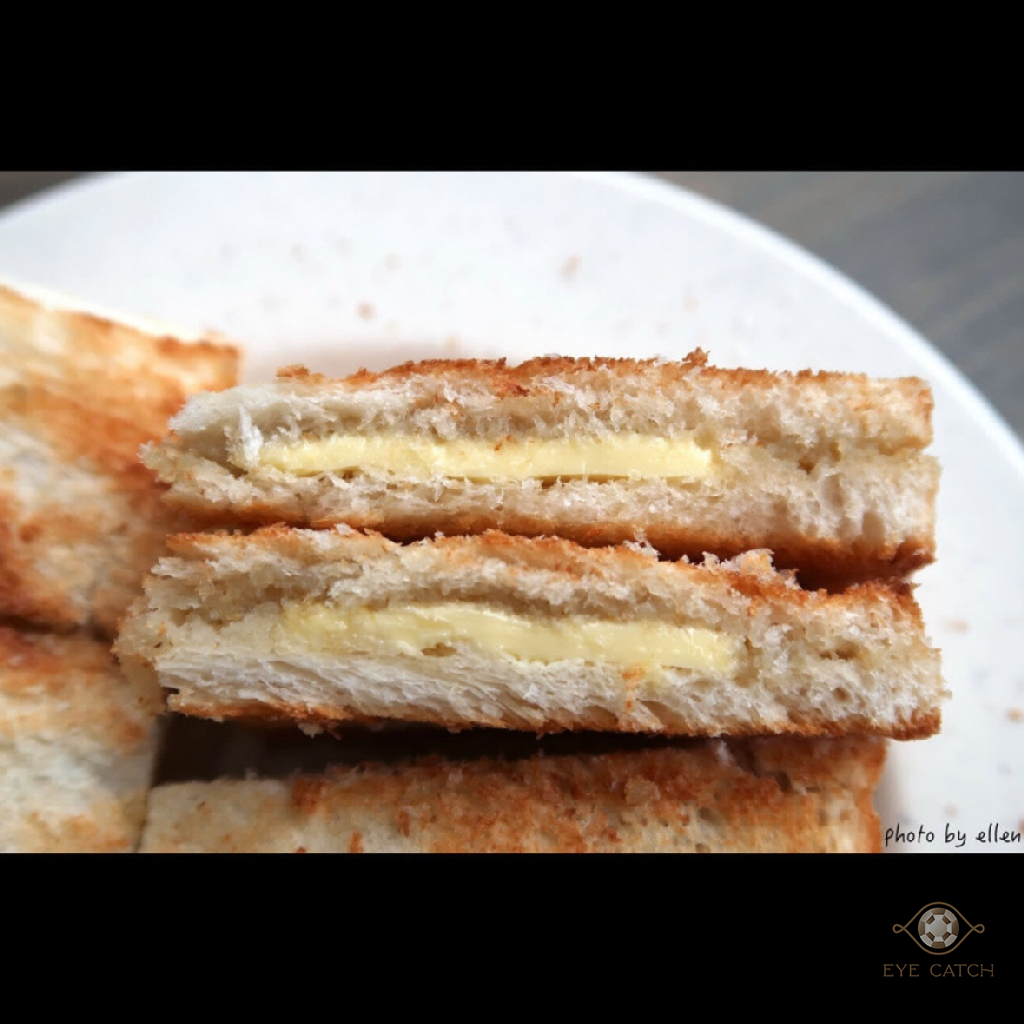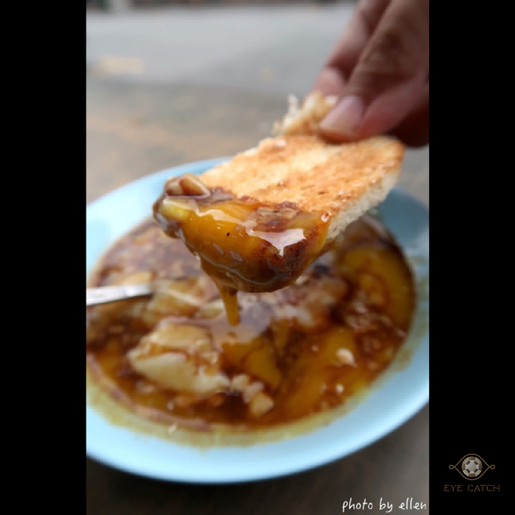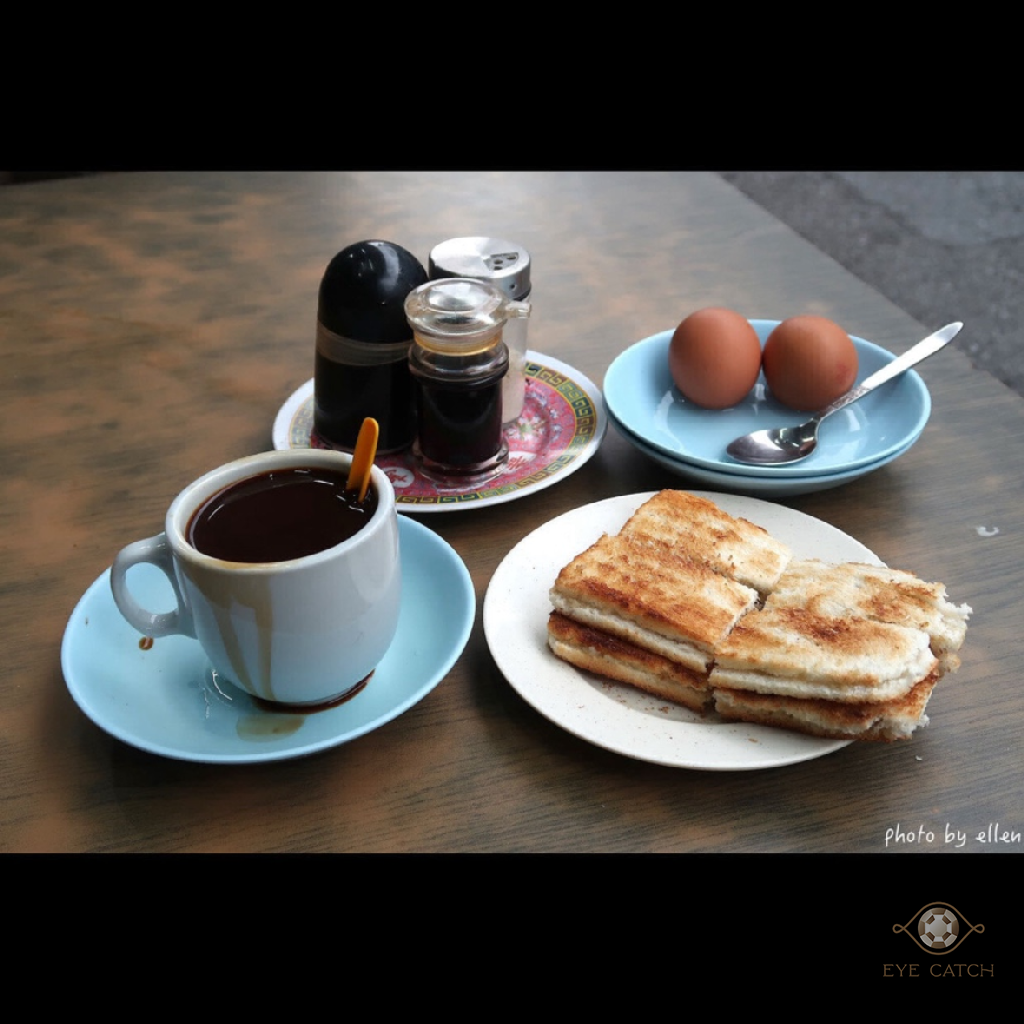 酥脆薄片吐司抹咖椰夾奶油, 薄片吐司烤到酥酥脆脆, 幾乎沒了吐司的柔軟像點心一樣, 吃前三塊覺得美味, 不過因為比一般咖椰吐司乾許多, 適合配咖啡和雞蛋享用, 半熟生雞蛋滴幾滴醬油撒白胡椒即完成, 沾著吃, 味道好豐富